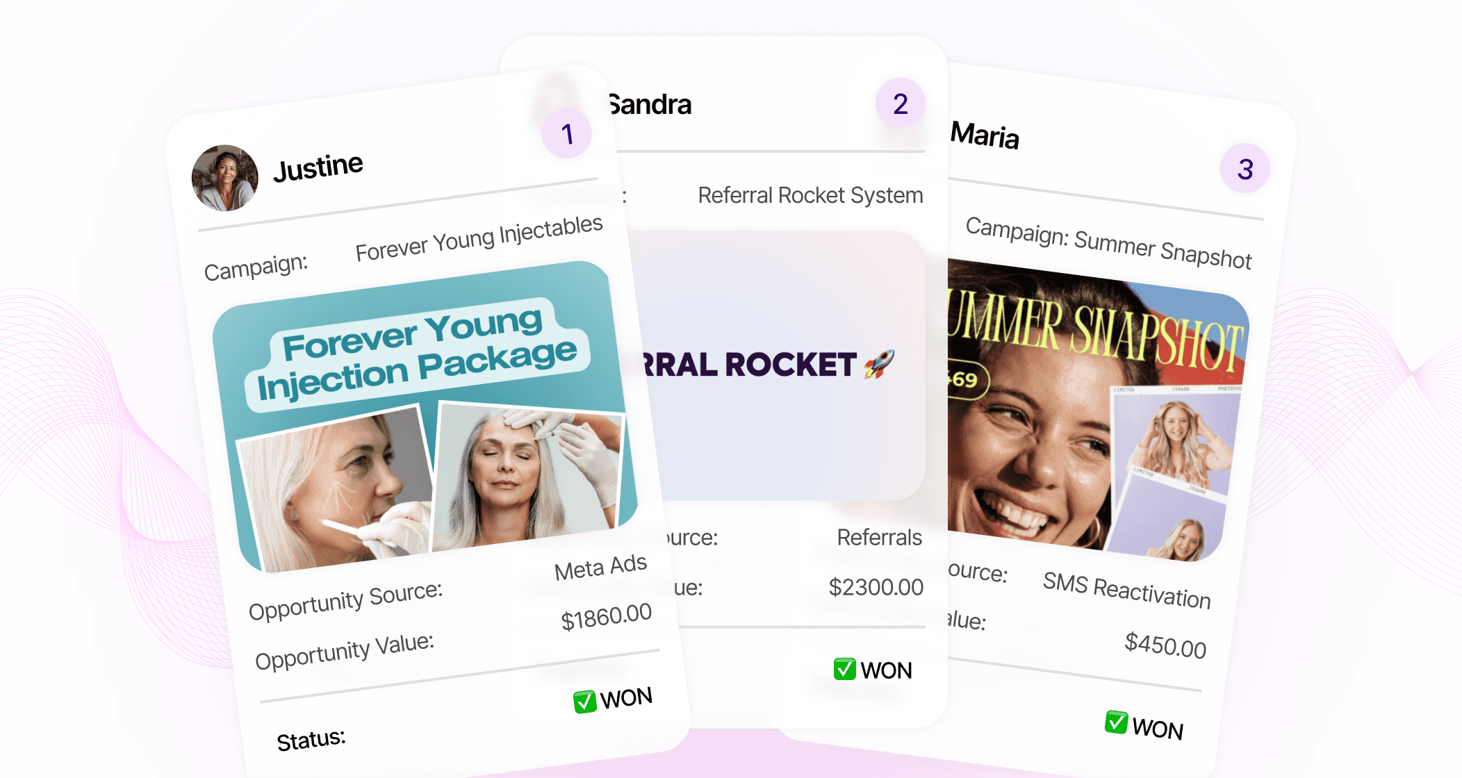 Use our 3-click campaign launch system to activate META ads, referral programs, and SMS reactivations.